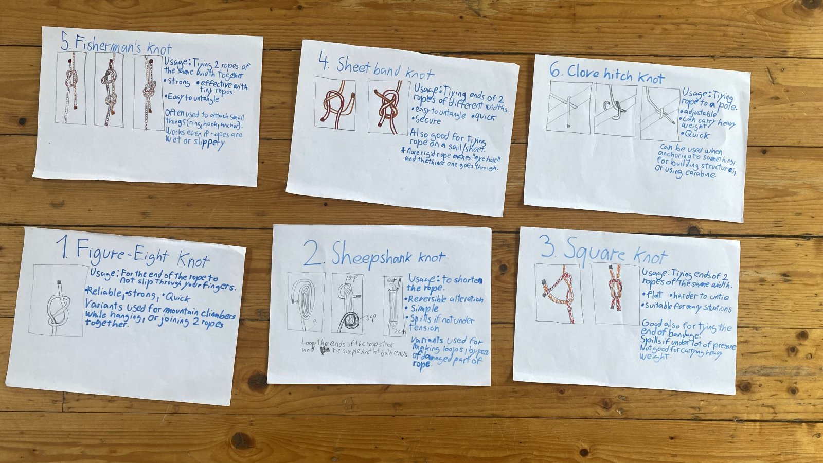 Näiteks Slovakkia tiimi poolt läbi viidud töötuba "Kuidas hakkama saada ilma standardmugavusteta" õpetas muuhulgas siduma uusi sõlmesid, mis olid väga hästi paberitele joonistatud. Lisaks õppsime grupperima esemeid kohta mida võib vaja minna näiteks matkal või elektrikatkestuse korral. (Võtsin ühe sõlme ka kasutusse)