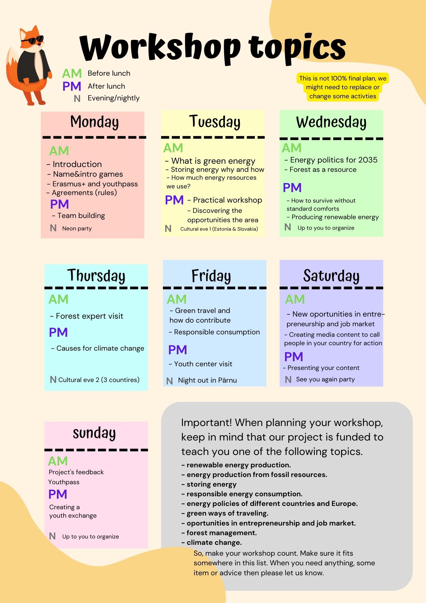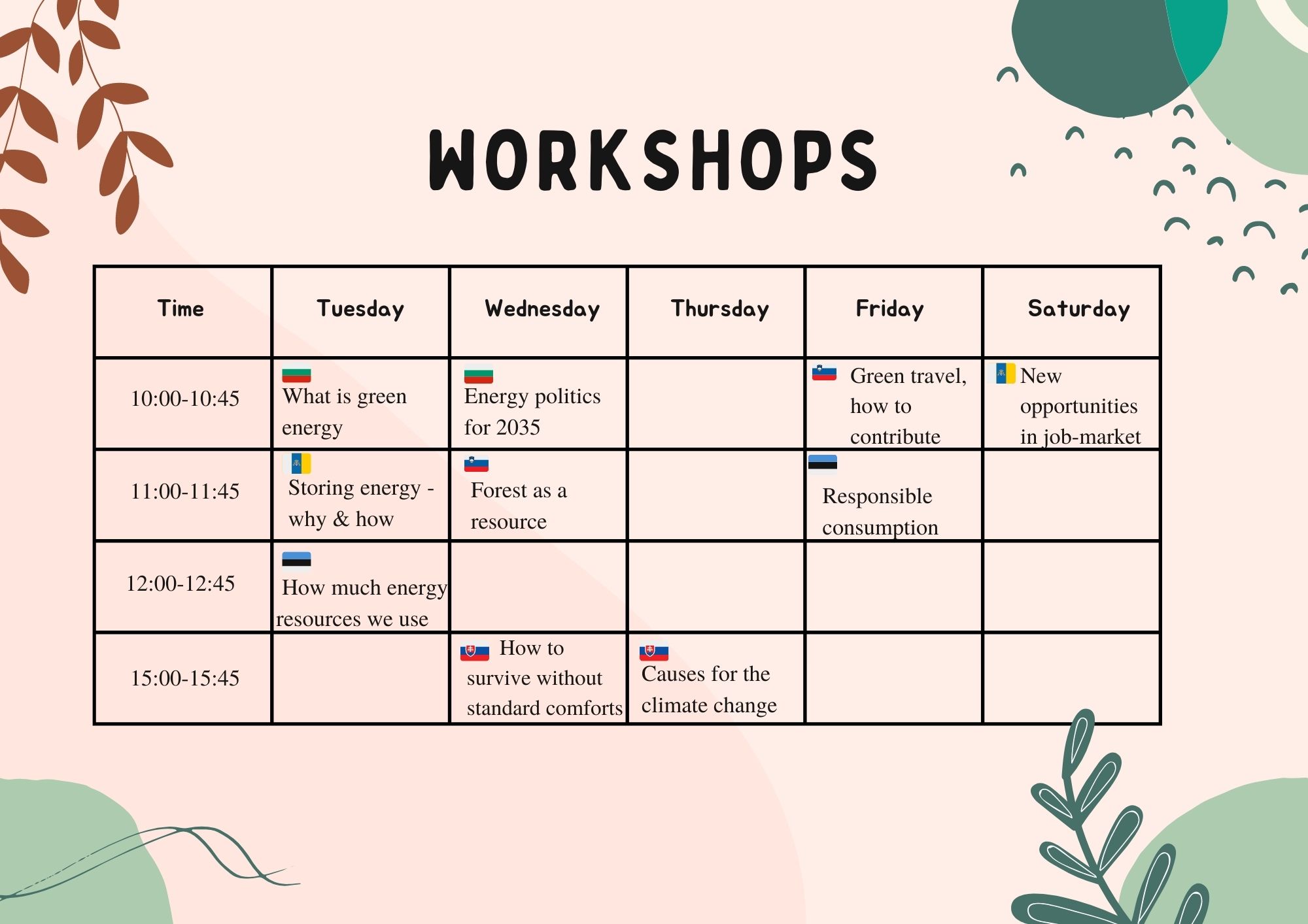 Nii nagu kõigil interESTi noortevahetusel ja Erasmus+ programmis soovitatud, olid ka seekord paljud töötoad osalejate enda kanda. Korraldustiim tegeles projekti sissejuhatamise, tiimimängude ja viimasel päeval kokkuvõtvate töötubadega. Nii on programmi sisus osalejatel võimalik küllaltki palju kaasa rääkida. Peab tõdema, et paljud töötoad olid päris lihtsa ettevalmistusega kuid oli ka üllatajaid.
