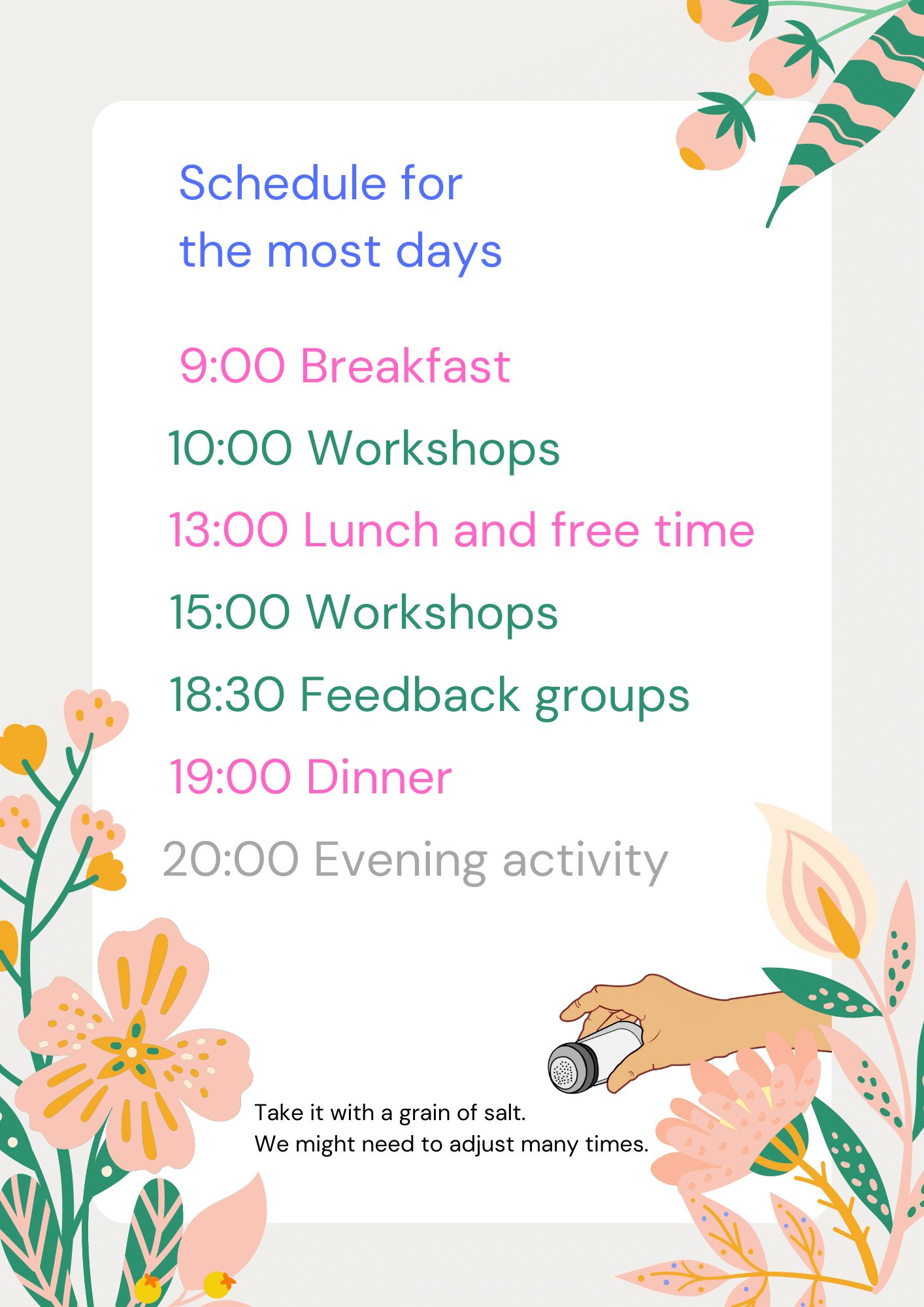 Kuna Jõulumäe on väljas liikumiseks loodud, siis pidime trotsima ka septembri ootamatut külma ilma. Ootamatult pidime jagama end siseruumide ja välialade vahel, leppides kokku enne igat töötuba kus see seekord toimub. Õnneks oli ka veidi päikeselisemaid päevi ning ilmast hoolimata said osalejad mängida jalgpalli, võrkpalli, discgolfi ning nautida ümbritsevat rohelust.