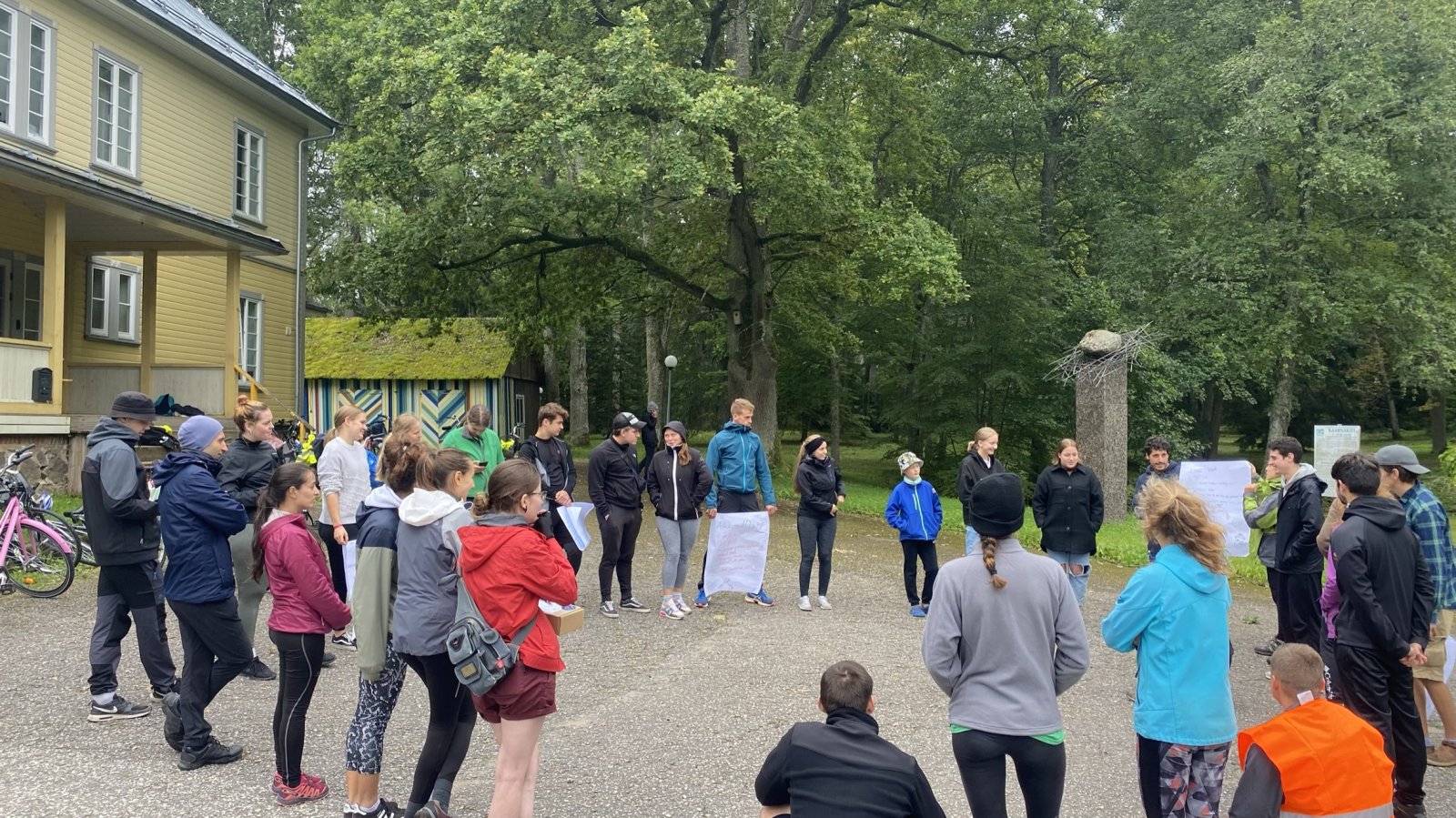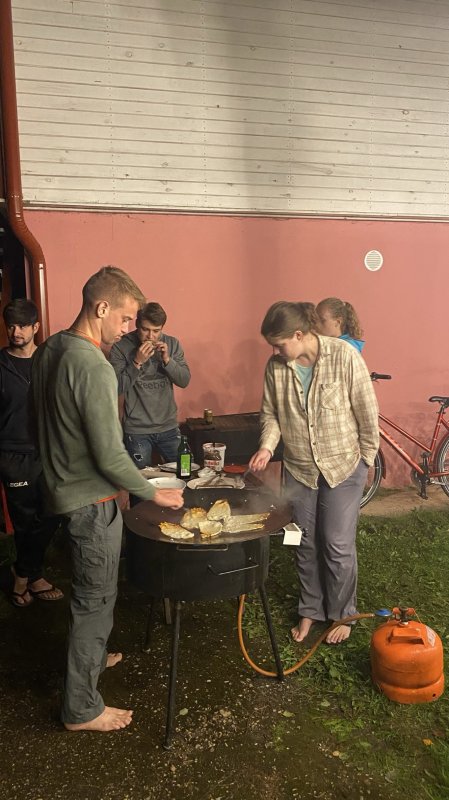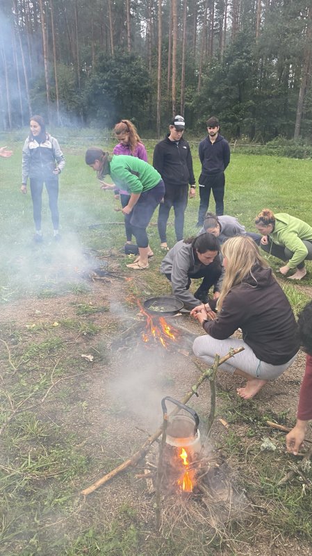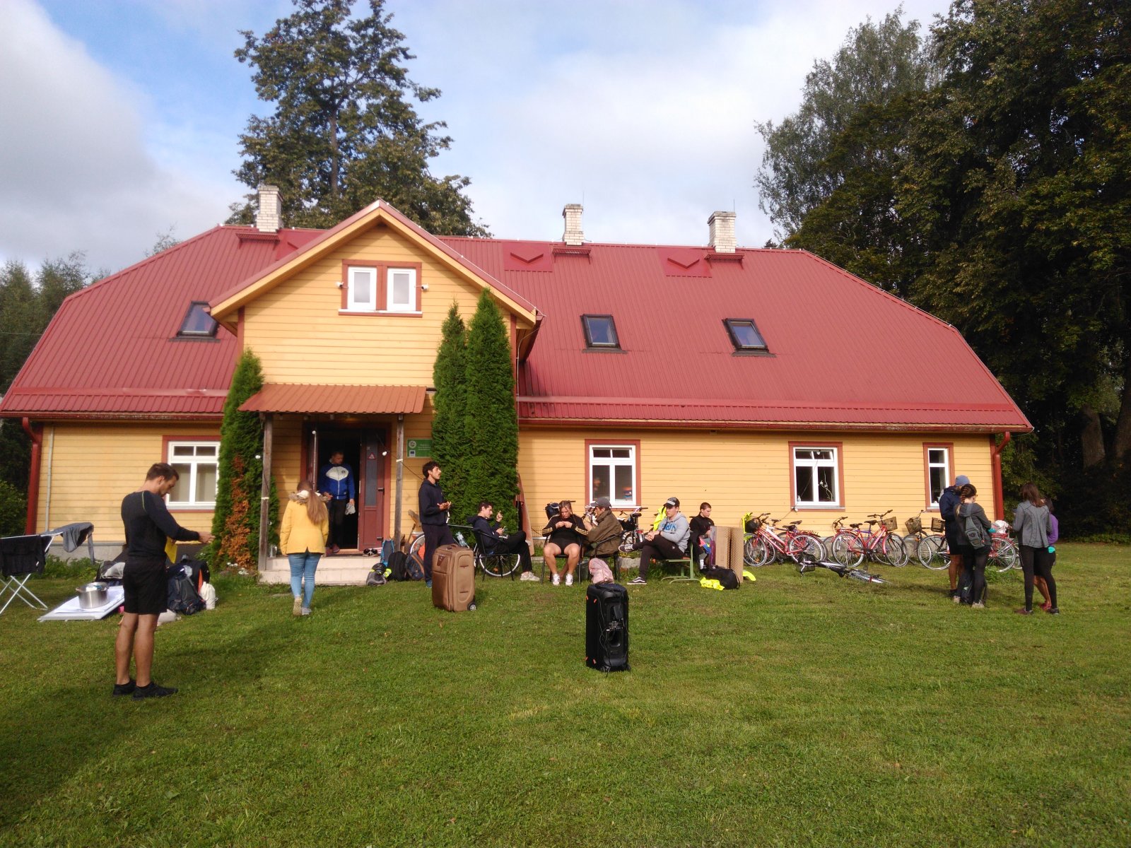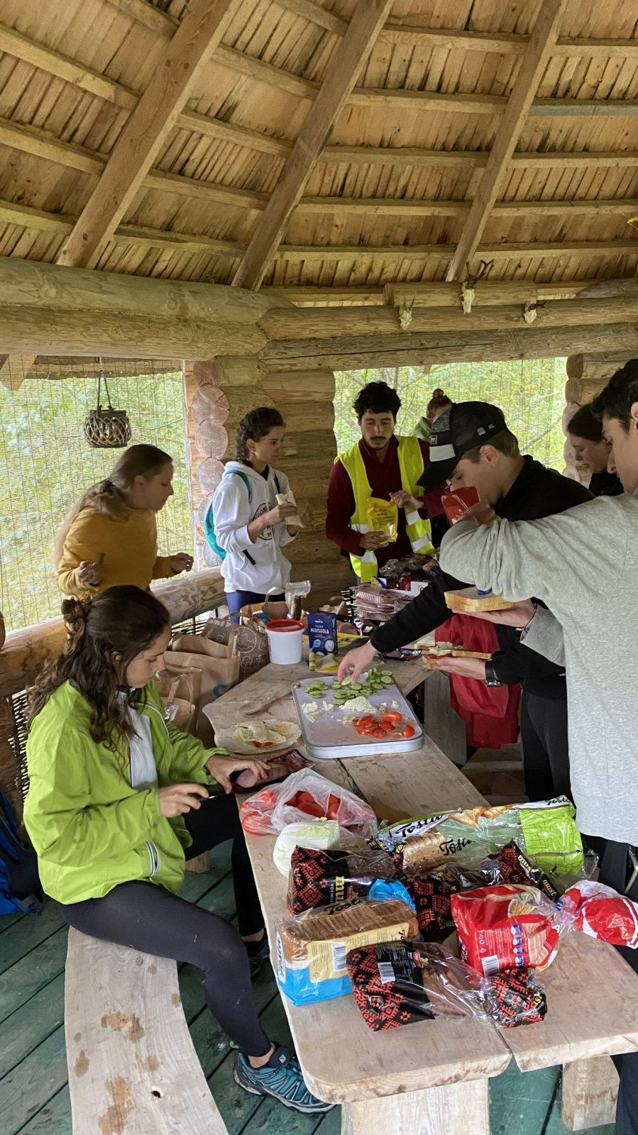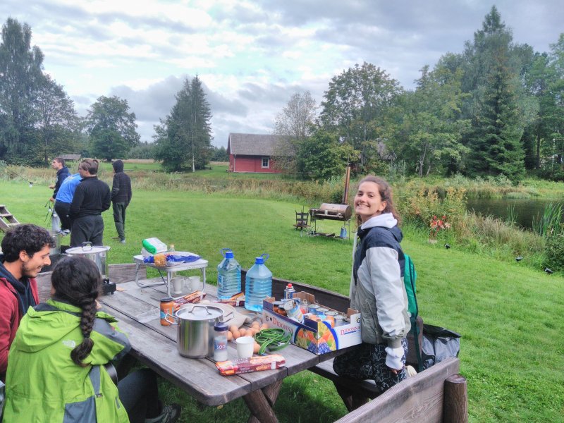 Meie viimane ööbimiskoht Lõuna-Eestis oli väga askeetlikus kohas, kus oli välikäimla ehitatud heinapallide vahele. Päikesepaneelid andsid majja elektrit, millest vaevu piisas telefonide laadimiseks. Joogivee saamiseks oli õuepeal kaev. Palju mõtteainet selle ööbimiskoha valikul pakkus see, et neil oli pakkuda meile vaid 15 voodikohta. Mõtlesime pikalt, kas laenata ülejäänud vajalikud madratsid-magamiskotid, või hoopis osta midagi odavat. Et noortevahetus on piiratud eelarvega ja samas loodushoiu ja vähese tarbimise teemal, ei soovinud me ka maailma tarbetut prügi tekitada. Viimaks otsustasime siiski osta hästi odavad magamiskotid (mida edaspidi saame samuti kasutada), sest rentimine oleks läinud veelgi kallimaks. Madratsite osas saime ühest lastelaagrist väljavahetamisele minevad madratsid (Aitäh Kullo Karepa laager ja laagrijuhataja Anu!). Nii oli väheste voodite probleem ka lahendatud ja korralduslikud ettevalmistused tehtud.