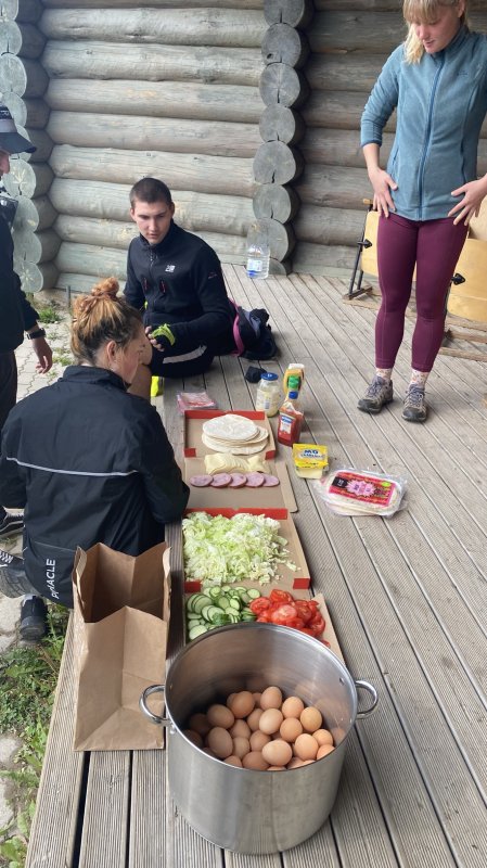 Jalgratastel Lõuna-Eestis rännates polnud tee peal just palju toidukohti, kus oleks võimalik keha kinnitada. Nii tegime paljud hommiku-, lõuna- ja õhtusöögidki ise. Meil oli kaasas oma vokipann, gaasipliit ja muud vajalikud tarvikud. Õnneks enamus majutuskohtades oli ka väga hästi varustatud köögiosa. Vokiga saime teha pannkooke ja tortillasid. Küll aga võib öelda, et söögi tegemine vajas väga palju organiseerimist ja söögid ei valminud iseenesest. Kes käib poes, mida üldse valmistada, mida osta, kust saada väikest potti, kust suurt nuga - tegemist oli. Õnneks meie noored olid väga asjalikud ja võtsid initsiatiivi - kõik valminud toidud olid imemaitsvad ja kõhtu täitvad!