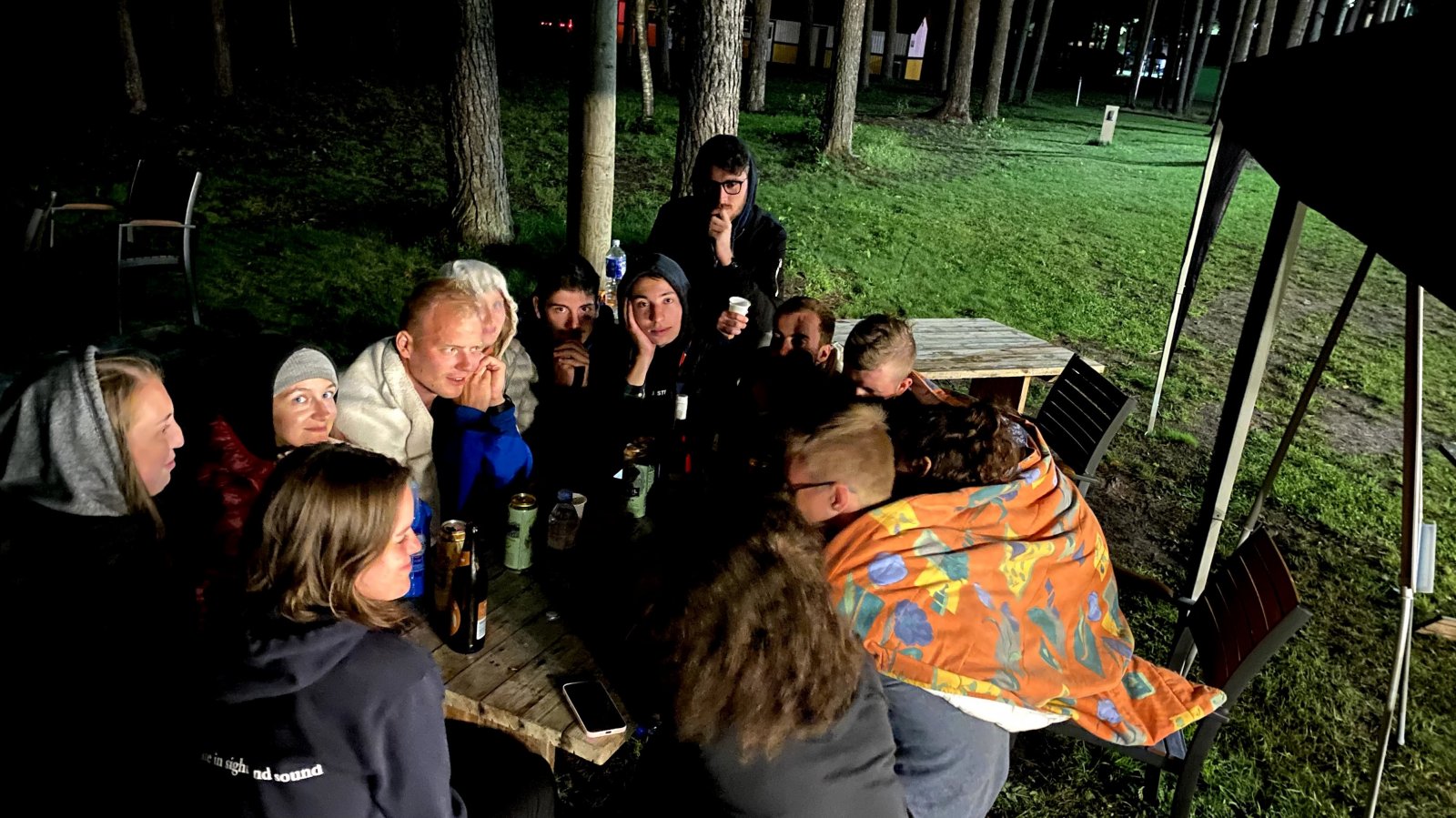 Mõned varajased saabujad aitasid ka välisõppe klassi üles seada. Nii ilusas kohas sooviks ju värske õhu käes olla. Samuti pidi arvestama, et meie projekti noortel oleks õhtul koht kus olla, ilma et me kedagi segaks. Jõulumäel oli mitmeid teisi laagrigruppe ning nooremad spordilapsed peavad normaalsel ajal öörahu saama. Välisõppe klass õnnestus väga hästi, nii töötubasi kui ka õhtuseid koosviibimisi oli hea läbi viia meie enda väikeses nurgakeses männipuude vahel. Valguskett tekitas mega mõnusa atmosfääri ja keegi pimedas telefon taskulambiga koduteed ei otsinud.